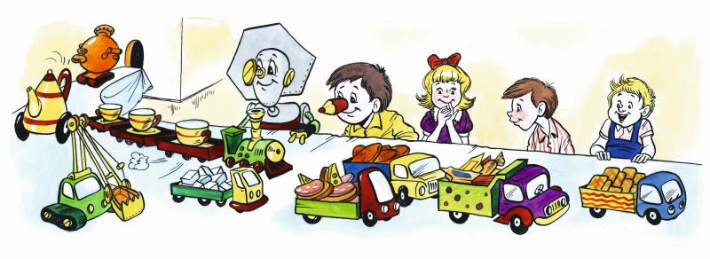 Ребята сели за стол. А на столе ничего не было, одна ровная пустая белая скатерть. Самоделкин слегка махнул рукой. На стенке столовой открылось окошко на кухню, и прямо на стол из окошка, гудя и посвистывая, вышел маленький игрушечный поезд. Алый нарядный локомотив тянул за собой платформы, а на каждой платформе стояла чашка с блюдцем и тарелочка.