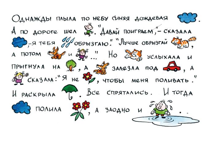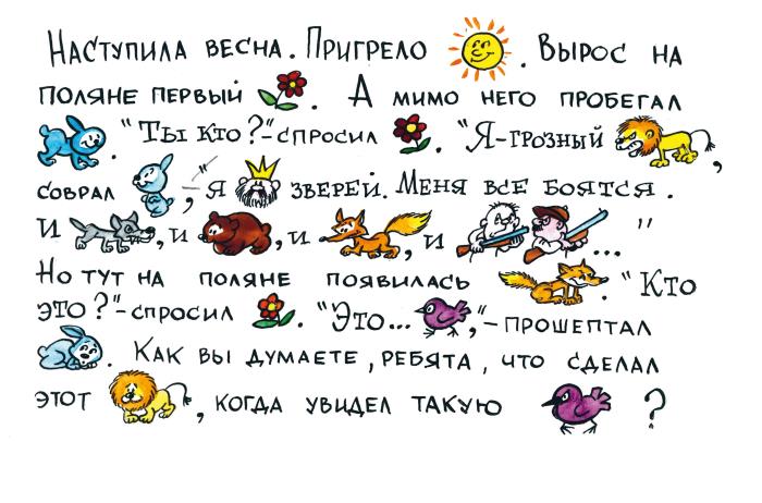 – Очень хорошо, – похвалил учитель. – Я сейчас напишу на стене одну сказку. Некоторые слова я в ней нарисую. А чтобы эти мои картинки не оживали, я буду оставлять их недорисованными. Вот слушайте… Наступила весна…