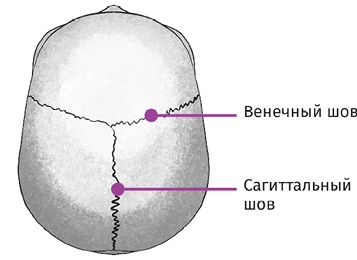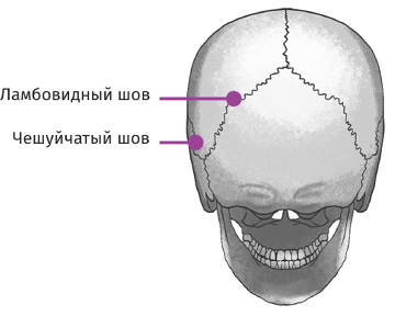 Кости черепа соединяются при помощи швов (см. рис. 3, 4). Кости лица, прилегая друг к другу ровными краями, образуют плоские (гармонические) швы. На месте соединения чешуи височной кости и нижнего края теменной кости образуется чешуйчатый шов. К зубчатым швам относят венечный, сагиттальный и ламбдовидный швы. Венечный шов образуется соединением теменных костей и лобной кости. Соединение между собой двух теменных костей образует сагиттальный шов. Соединение двух теменных костей и затылочной образуют ламбдовидный шов.