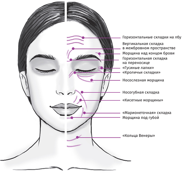 При регулярно повторяющихся эмоциях происходит различное напряжение близлежащих мышц, одни находятся в постоянном напряжении, другие расслаблены. Соответственно, рельеф мышц и видимый кожный слой лица становится неровным, с провалами, буграми и стеканием одного слоя относительно другого (см. рис. 7).