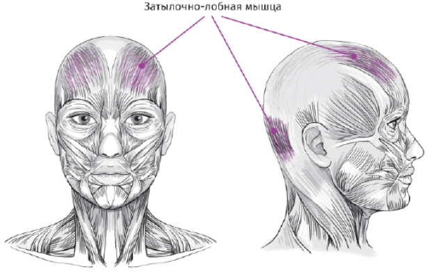 Надчерепная мышцаСостоит из передней части – лобного брюшка, прикрепляющегося к коже бровей и затылочного брюшка, берущего начало от сосцевидного отростка и верхней выйной линии (см. рис. 8). Обе части соединены тонким и плоским растяжением – апоневрозом, который называется сухожильным шлемом. При сокращении только лобного брюшка кожа лба образует горизонтальные морщины, расширяется глазная щель и поднимаются вверх брови. Сокращение мышцы в целом оттягивает сухожильный шлем вместе с кожей назад. Участвует в таких эмоциональных реакциях, как страх и удивление.