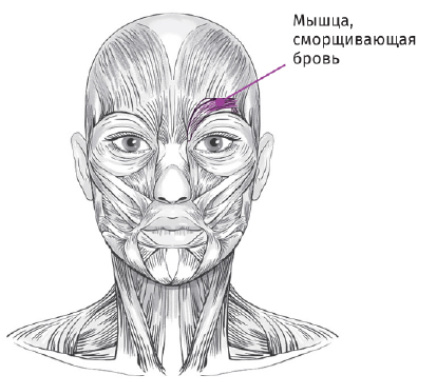 Мышца, сморщивающая бровьРасполагается под круговой мышцей глаза и лобным брюшком надчерепной мышцы (см. рис. 9). Начинается от носовой части лобной кости, косо пересекает надглазничный край и прикрепляется к коже бровей. Здесь ее пучки переплетаются с волокнами лобного брюшка. Мышца сводит кожу бровей к срединной линии, образуя вертикальные складки в области переносицы.