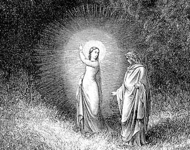 Взглянув, я увидел; твореньяНебесные эти бросатьЦветы уже тут перестали,И там Беатриче видатьПришлось мне, стоящей лицом ужК Той Птице, и тут мне онаПрекрасней еще показалась,Чем в жизни земной той была.И чувство раскаянья мноюНастолько владело тогда,Что мне показалось, как будтоБожественна даже она!И совесть настолько терзалаМеня, что без чувств я упал…[34]С этой минуты собственно и начинается счастливая пора в жизни Данте. Он обрел блаженство, потому что обрел Беатриче. Пройдя ад, иными словами, пройдя земную жизнь с ее греховными страстями, он добрался до чистилища – сознания ничтожества этих страстей и стремления в полному освобождению от них, чтобы, очищенному и просветленному, удостоиться, наконец, лицезрения Беатриче – идеала высшей жизни.