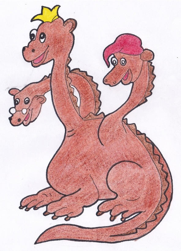 Одна голова была лопоухая, и на ней небрежно болталась корона, которая оказалась ей не по размеру. Вторая голова улыбалась самой глупой улыбкой и, больше того, постоянно строила рожи и даже показала Мун язык. И головной убор у неё был соответствующий – маленький шутовской колпачок с бубенчиками! Третья голова вообще ни на кого не обращала внимания, разговаривала сама с собой, философствовала!