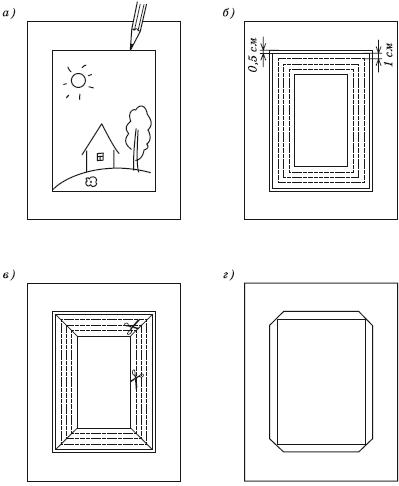 Приложите работу к листу бумаги и обведите края простым карандашом (рис. 2, а). Отложите работу в сторону. Внутри нарисованного прямоугольника с помощью линейки проведите еще четыре линии, чтобы получился другой прямоугольник, поменьше. Расстояние между сторонами этих прямоугольников должно быть примерно 1 см. Теперь пунктирными линиями проведите еще четыре прямоугольника, расстояние между их сторонами 1 см (рис. 2, б).