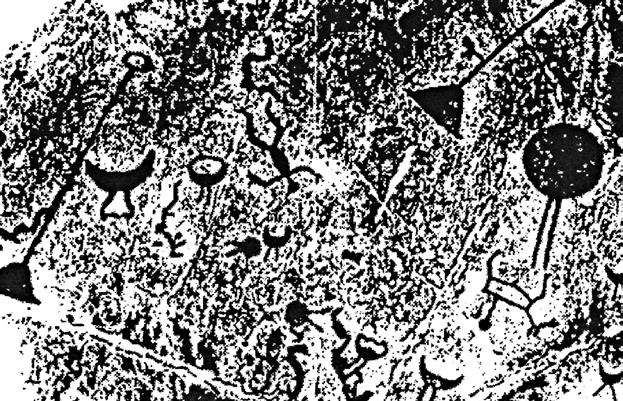 Начнем с тех из них, к которым относятся две идентичные конструкции, представляющие собой оси с кольцом на одном конце и топоровидным треугольником на другом. Это маятники. Причем, каждый из маятников обладает регулировкой амплитуды. Обратите внимание на верёвочки с грузиками, прикреплённые к осям маятников: передвигая их по оси вверх и вниз, можно добиться для маятника нужной амплитуды движения. Маятники в каменном веке? Один из маятников относится к большому (темному) кругу с двумя выходящими из него усами – указателями движения: это изображение Солнца. В центре круга знак – пятиконечная звезда (видно её плохо, таково качество иллюстрации). Другой маятник относится к серповидному знаку со связанными усами изогнутой формы: это символическое изображение выхода вещества (кометного хвоста). Символы ограничивают композицию. И тот и другой обозначают светила системы двойной звезды, одно из которых подчинённое, выраженное знаком спутника – полумесяцем, – это Селен-Фаэтон. Впоследствии данный символ был упрощён и оказался закреплён за Луной – спутником Земли, впрочем, как и имя.