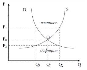 Равновесная цена (рыночная) – точки пересечение кривых. Точка переместится вправо или влево при нарушении баланса. Повышение цены – сигнал к повышению производства и образования излишков. С понижением цены спрос повысится и возникнет дефицит.