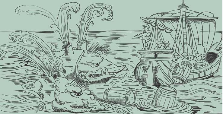 Мореплаватели сбрасывают бочки, спасаясь от китов. Со старинной миниатюры