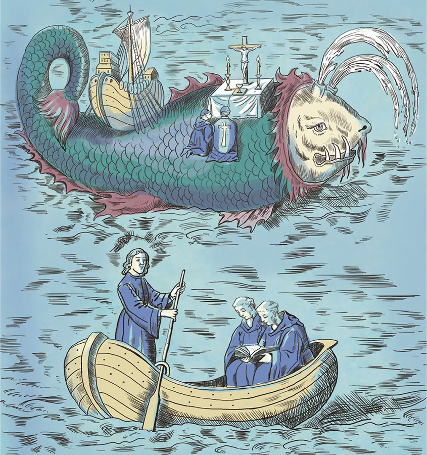 Однажды во время Пасхи команда высадилась на небольшом острове, чтобы отслужить праздничную мессу. Только развели огонь и достали необходимые принадлежности, как вдруг остров зашевелился. Как вы уже догадались, он оказался спиной кита. Любой нормальный кит, почувствовав, что у него на спине разожгли костер, немедленно нырнул бы, смыв с тела докучливую братию. Но аббат Брендан вознес пламенную молитву Господу, и кит подождал. Он ушел в глубину только после того, как все монахи благополучно эвакуировались на свой корабль.
