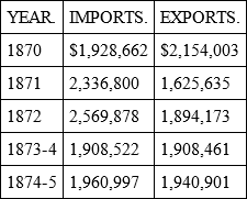 The following is the value in dollars of the imports and exports of the island from 1870 to 1874, inclusive. The returns represent a rate of progress to which, perhaps, no parallel can be produced in the British Empire:10