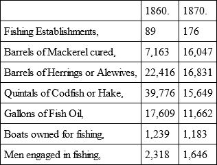 Prince Edward Island is the best fishing-station within the Gulf of Saint Lawrence. But this important department of industry has not been cultivated to anything like the extent it ought, – being mainly carried on with United States capital. The following table from the census of 1870 shows that there had been, from 1860 until 1870, little, if any, progress: —