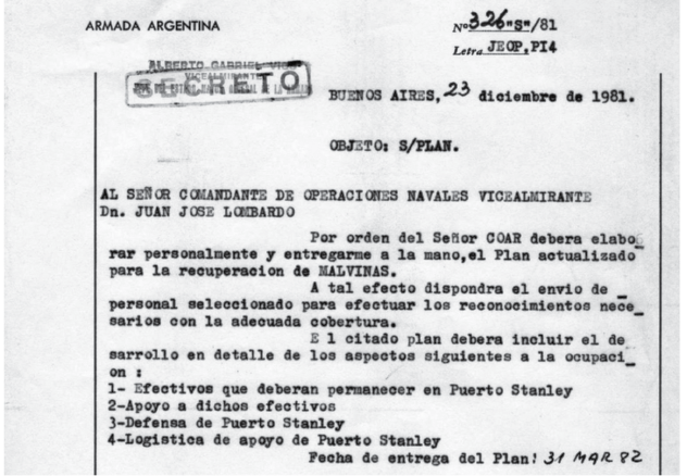 El vicealmirante Alberto Gabriel Vigo le envió el documento “secreto” n.º 326/81 al vicealmirante Juan José Lombardo con la instrucción de que “deberá elaborar personalmente, y entregarme a la mano, el Plan actualizado para la recuperación de Malvinas”.