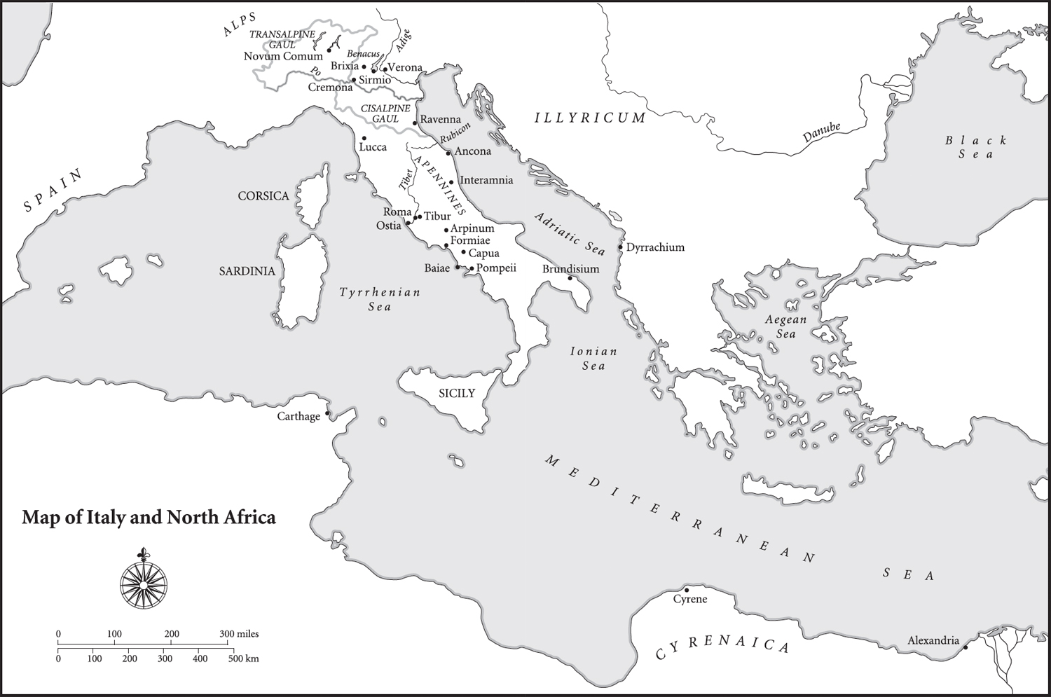 So Catullus found himself surrounded by towering politicians: Pompey the Great, Marcus Licinius Crassus, Julius Caesar, who vied desperately for power over Rome and her empire, which was larger than it had ever been, and growing larger still. By the time Catullus was born, the Romans had made provinces of North Africa, Sicily, Sardinia, and Corsica; Spain, which they divided into two provinces, Nearer and Further; Transalpine Gaul, stretching across the south of France and north-east into Switzerland; Cisalpine Gaul, which encompassed northern Italy, including Catullus’ Verona; Macedonia; Asia (western Turkey), and extended their global rule through numerous allied states.