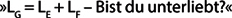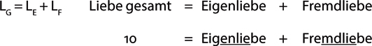 Wenn du dich selbst nicht sehr magst, dann setze zum Beispiel bei LE eine Zwei oder eine Drei ein (bei null oder eins bist du eh schon im psychischen Koma). Wenn du auch von anderen nicht sehr gemocht wirst – zum Beispiel von deinen Eltern oder deinen Kindern – sagen wir zum Beispiel nur im Ausmaß von 3, dann schaut deine persönliche Liebesgleichung zum Beispiel so aus: