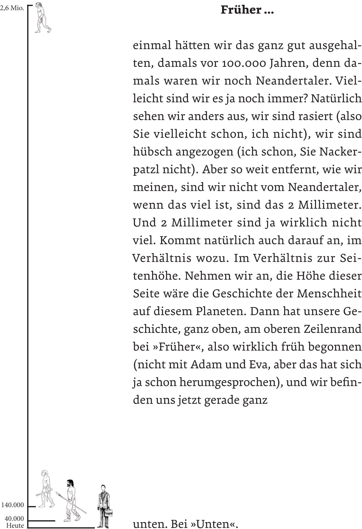 Prinzipiell gehe ich davon aus, dass alle, die diese Zeilen lesen, leben. Es sei denn, Sie sind soeben vor Schreck, vor Hunger, vor Begeisterung oder vor Lachen gestorben. Obwohl, so lustig war’s ja bis jetzt noch nicht. Wird es auch nicht mehr. Wir leben also beide. Wobei es durchaus sein kann, dass während Sie dieses Buch lesen, die Lebensgeschichte des Autors bereits Geschichte ist, davon möchte ich aber jetzt nicht ausgehen. Wir zwei Hübschen (egal ob nun nackt wie Sie oder bekleidet wie ich) leben aber in einer anderen Realität. Jeder von uns lebt seine Lebensgeschichte in seiner Welt, und der moderne Mensch kann sich heute sehr viele Welten aussuchen, vollkommen unabhängig vom Ort. Selbst in einer natürlichen Umgebung, in einem Wald – auf neutralem Boden sozusagen – macht es einen großen Unterschied, ob man Mountainbiker ist oder Jäger. Zur gleichen Zeit am selben Ort, und doch ganz woanders, in einem Paralleluniversum sozusagen. Oder ein anderes Beispiel: Sie sind mit dem Auto unterwegs (denn da ist man in der Regel öfter, weil es dort so schön ist und viel bequemer als im Wald), dann ist die Geschwindigkeit, mit der Sie unterwegs sind, die einzig richtige, die man zu diesem Zeitpunkt auf dieser Landstraße fahren kann. 94,3 Stundenkilometer. Wenn nun jemand vor Ihnen mit 86,9 Stundenkilometern dahinschleicht, also um 7,4 Stundenkilometer langsamer als Sie, dann ist dieser Jemand für Sie: