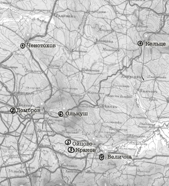 Первой локацией экспедиции стал Ченстохов, где студенты изучали юрские осадки в известковых карьерах на Ясной Горе и Заводзе и собирали аммониты. Дальше был Домбров с его каменноугольными и триасовыми породами и угольными шахтами. Управляющий угольных копей «Немцы» устроил им теплый прием: прислал на станцию экипажи, накормил завтраком и назначил главного инженера ответственным за экскурсию в шахты. В Кракове смотрели меловые и четвертичные отложения, посещали геологические музеи. Четвертой точкой стала Величка с третичными соленосными залежами и копями. В Ойцово студенты изучали процессы размывания и выветривания, осматривали древние пещеры с четвертичной фауной и остатками палеолитического человека. В Олькуше изучали триасовые отложения, дюнные образования и рудный район. Завершилась экскурсия в Кельце – рассматривали силурийскую и девонскую системы и кряжеобразовательные70 процессы.71 Там студенты, по традиции, устроили благодарственный ужин профессору Амалицкому. Экскурсия дала участникам «солидное представление как о практических методах науки, так и о геологическом строении самых интересных мест» этих польских губерний.72