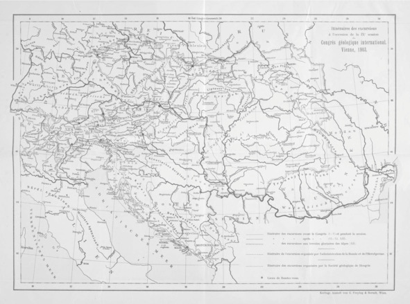 Некоторые геологические экскурсии проходили до начала конгресса, другие же – по завершении. Кроме того, заседания чередовались с короткими однодневными экскурсиями в окрестности Вены. Путеводитель общим объемом более тысячи страниц состоял из отдельных брошюр для каждой такой поездки. Геологическое строение территорий бывшей Австрийской Монархии чрезвычайно разнообразно, поэтому и экскурсии были самыми разными: палеозойские отложения Богемии, Остравско-Карвинский каменноугольный бассейн, отложения Альпийского триаса, ледник Карлсайсфельд и пр.167
