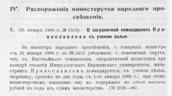 В этот раз Павел Александрович просил отправить его за границу на два года. Распоряжением Министерства народного просвещения от 21 января (3 февраля) 1906 г. «с Высочайшего соизволения» магистрант Православлев был командирован с научной целью за границу с 1 (15) января 1906 г. При этом министр назначил ему содержание в размере 1 000 руб. в год.194 Организация поездки заняла какое-то время, выехал он из Варшавы только в марте месяце.195
