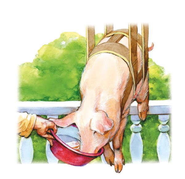 Но как научить Хрюшку летать? Я тогда жил на даче. Вот мы с Хрюшкой вышли на балкон, а на балконе у меня был устроен блок и через него переброшены обшитые войлоком ремни. Я надел на Хрюшку ремни и стал осторожненько подтягивать её на блоке. Хрюшка повисла в воздухе. Она отчаянно заболтала ногами и как завизжит! Но тут я поднёс будущей лётчице чашку с едой.