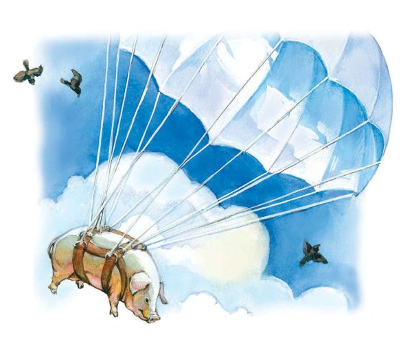 Когда шар был уже высоко, затрещал будильник. Хрюшка, привыкшая по звонку прыгать, бросилась с шара в воздух. Все ахнули: свинья камнем полетела вниз. Но тут парашют раскрылся, и Хрюшка, плавно покачиваясь, благополучно, как заправский парашютист, спустилась на землю.