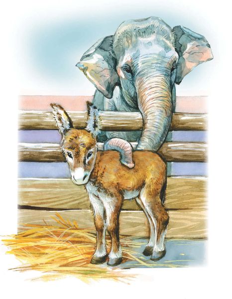 Раз Оська заболел расстройством желудка, и ему не дали обычной порции овса. Уныло опустив голову, он, голодный, скучал в стойле. А рядом Бэби, наевшись досыта, развлекался как мог: то положит клок сена в рот, то вынет, повертит во все стороны. Случайно Бэбин хобот с сеном потянулся к ослику. Оська не прозевал: он схватил сено и стал жевать. Бэби это понравилось. Он стал загребать хоботом сено и передавать его через перегородку другу-ослику…