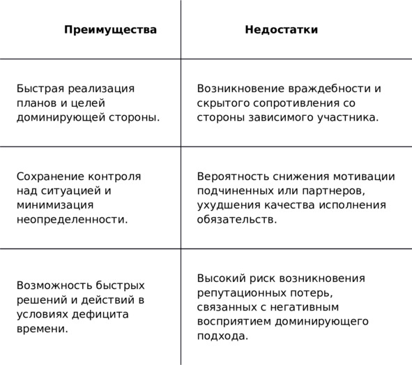 Использование данной стратегии оправдано лишь тогда, когда временные ограничения или внешние обстоятельства требуют немедленных действий, а зависимость партнера делает возможным быстрое достижение цели.