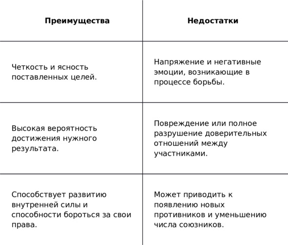Стратегия соперничества предполагает активное отстаивание собственного мнения и борьбу за свои интересы. Участник, придерживающийся этой стратегии, готов пойти на компромисс только в редких случаях, преимущественно заботясь о достижении личной победы. Давление оказывается настойчиво и целеустремленно, хотя уважение к мнению соперника сохраняется. Ключевая задача – обеспечить успех любой ценой, даже если это негативно скажется на взаимоотношениях.
