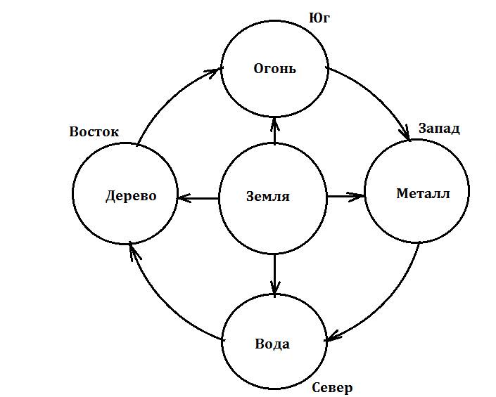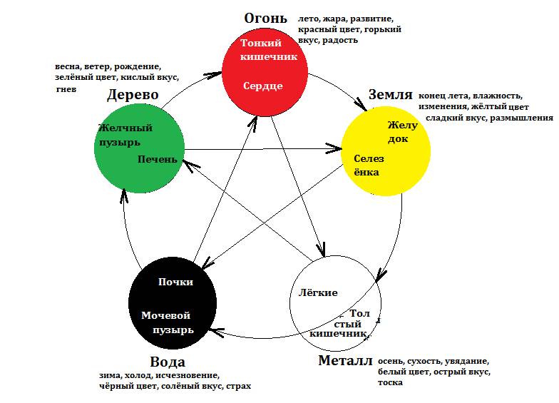 Чтобы рассмотреть циркуляцию энергии пяти стихий в теле человека, рассмотрим диаграмму, указанную на рисунке выше.
