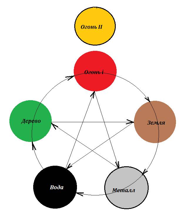 Сразу отмечу, что она полностью удовлетворяет концепции триединства Бытия. Дерево, Огонь, Земля, Металл, Вода, Огонь II (Материя) это первосубстанции, из которых состоит всё сущее. Они, в свою очередь, содержат в себе подробную Информацию, характеризующую каждый элемент системы, которая предопределяет их Направленность.