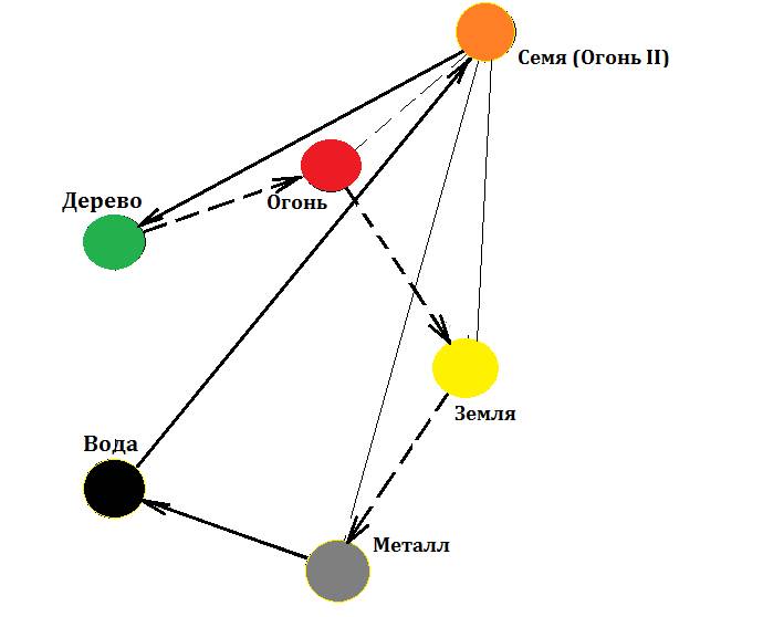 Изображение тока энергий, как формы существования материи, присущих каждому первоэлементу, приведет нас к следующей картинке, в которой каждому первоэлементу соответствует свой цвет. Семя – золотой, Дерево – зелёный, Огонь – красный, Земля – жёлтый, Металл – серый, Вода – чёрный.