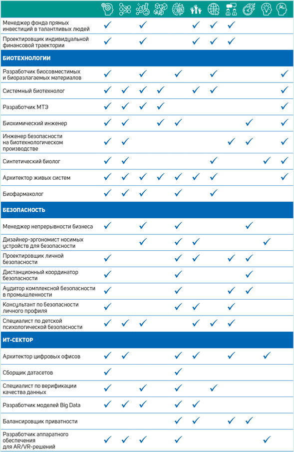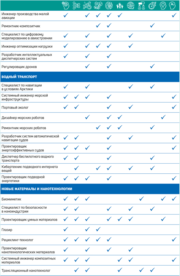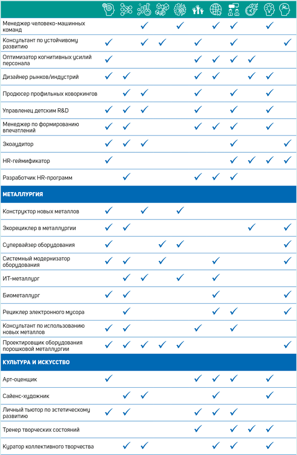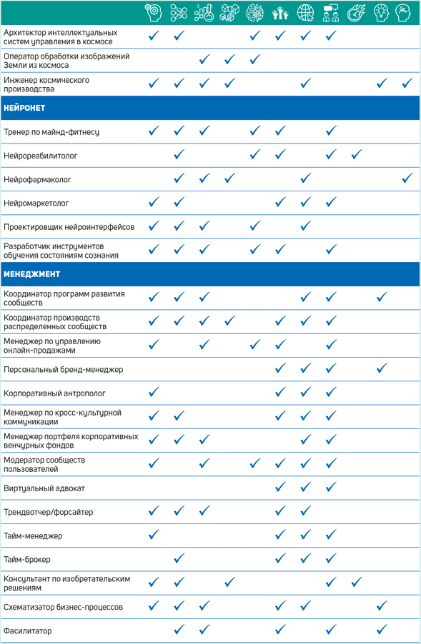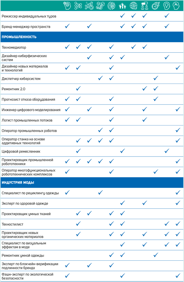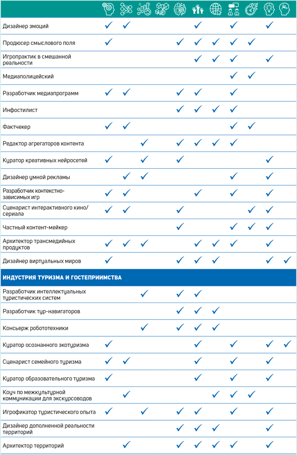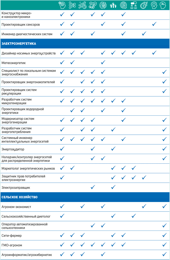 Для каждой профессии эксперты выделили набор важнейших надпрофессиональных навыков (подробно о них мы расскажем ниже). Эти навыки обозначены маленькими картинками.