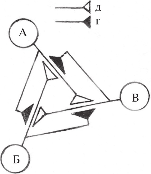 Рассмотрим обе идеализации на примере системы из трех нейронов – А, Б и В, связанных таким образом, что система функционирует как трехфазный генератор (рис. 1). Нейрофизиологическая феноменология такого рода характерна для реальных нейронных систем (в частности, для нейрональных генераторов ритмической мышечной активности). Интерпретируя, как это принято, такие системы в понятиях синапса, им приписывают свойство анатомической упорядоченности, связывая так наз. постсинаптические потенциалы и упорядоченную нейронную активность с наличием специфических контактов, как это сделано на рис. 2. По синаптической модели, сферой действия медиатора является синаптическая щель – компартмент межклеточного пространства, входящий в состав анатомического канала связи, синапса. Эта особенность модели позволяет пренебрегать разнообразием медиаторов: для функционирования рассматриваемой (рис. 2) и любой другой, сколь угодно сложной, нейронной системы необходим и достаточен один медиатор. В самом деле, при описании нейронных систем знаниями о химизме нейронов принято пренебрегать как несущественными.
