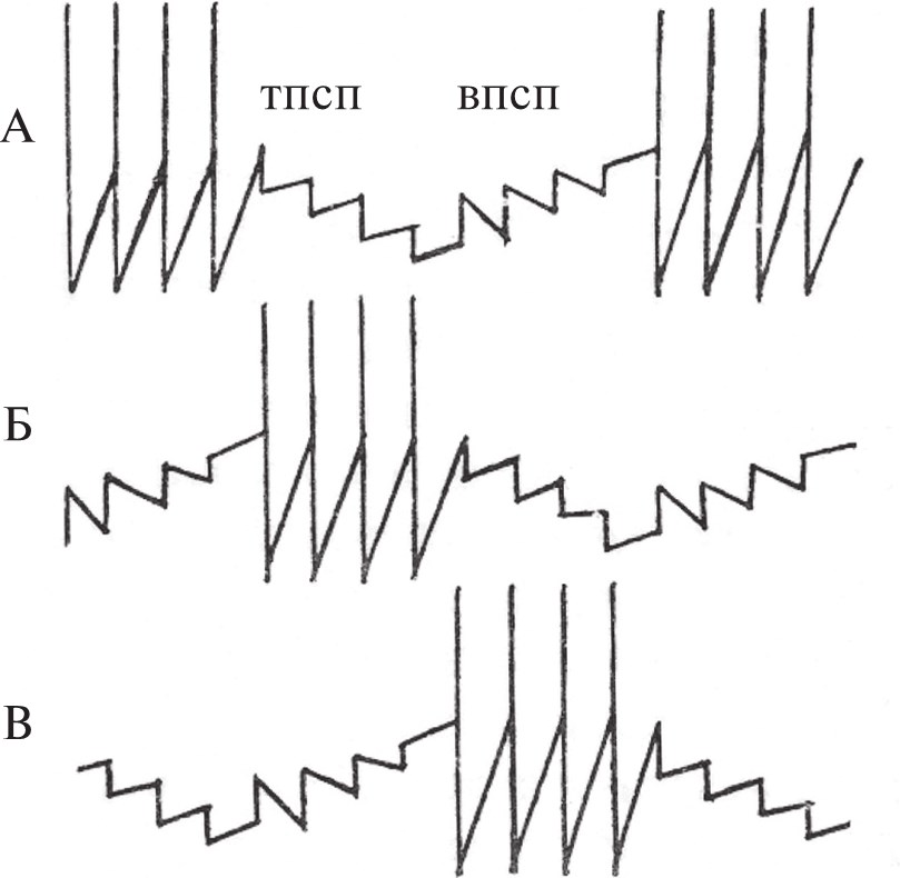 где д – деполяризующее окончание, г – гиперполяризующее окончание