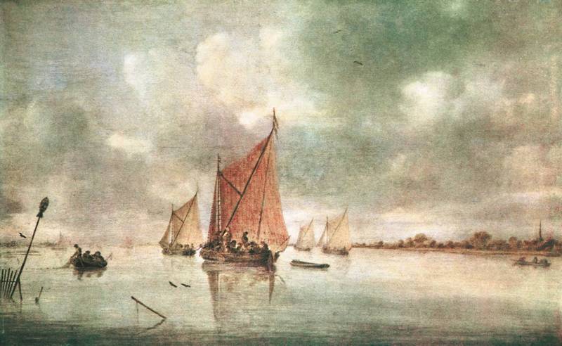 Больше динамики в работах Гойена, изображающих реки и морские просторы. Яркий пример тому – пейзаж «Река Маас близ Дордрехта» (1634, Эрмитаж, Санкт-Петербург). На полотне все охвачено движением. Суетливо снуют по воде рыбачьи лодки, плывут по волнам легкие парусники, стремительно несет свои воды широкая, словно море, река.