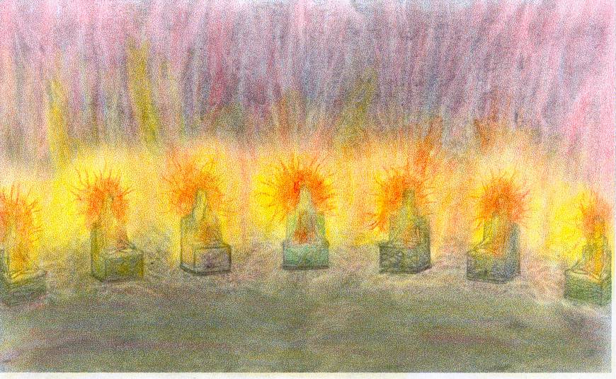 Как уже упоминалось раньше, они образовывали полукруг, и, так как их было семь, я сделал вывод, что центральная фигура должна быть главной, с тремя помощниками с каждой стороны. Конечно, в то время я был слишком переполнен чувствами, чтобы замечать такие детали. Это пришло ко мне позже.