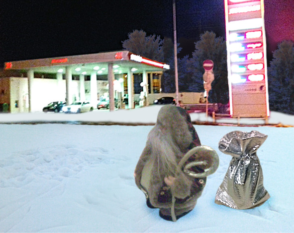 Потом стоящий у двери мешок с подарками сам выпрыгнул на снежную тропинку и помчался к заправочной станции, точнее к тому месту, где весело улыбались заправщик и его собеседник.