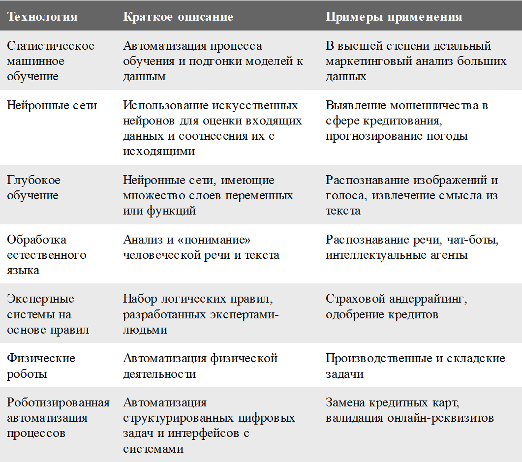 Однако важно понимать, что в повседневном применении терминов «искусственный интеллект» и «когнитивные технологии» наблюдается значительная неопределенность. Кое-кто включает в спектр в высокой степени статистические технологии вроде машинного обучения, хотя машинное обучение имеет больше общего с традиционной аналитикой, чем с другими формами ИИ. Некоторые из тех, кто считает машинное обучение искусственно интеллектуальным, даже предпочитают этот термин термину «искусственный интеллект». Кое-кто включает в сферу ИИ технологию роботизированной автоматизации процессов (RPA), которая пока не демонстрировала особой интеллектуальности. Я намереваюсь использовать термин «искусственный интеллект» в самом широком смысле, отчасти потому, что мир, похоже, склоняется именно к этому, а отчасти потому, что все технологии, претендующие на звание искусственного интеллекта, со временем действительно становятся более интеллектуальными.