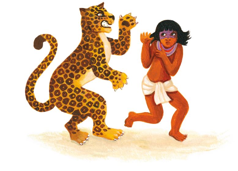 Не успел он и слова вымолвить, как жена ягуара бросилась к нему. В гневе она ударила его лапой и едва не вонзила острые, как кинжалы, когти в грудь мальчика.
