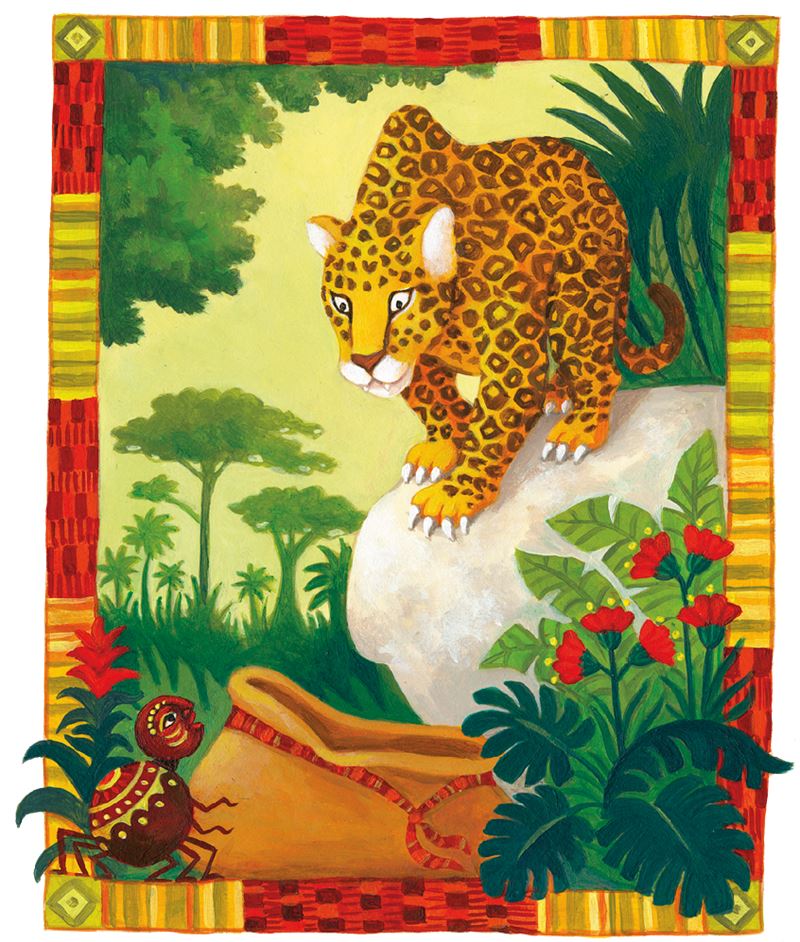 На следующий день Ананси с пустым мешком за спиной принялся бродить вокруг скалы, на которой грелся в лучах солнца изящный леопард. Хитрец, как и в предыдущий раз, бормотал себе под нос: