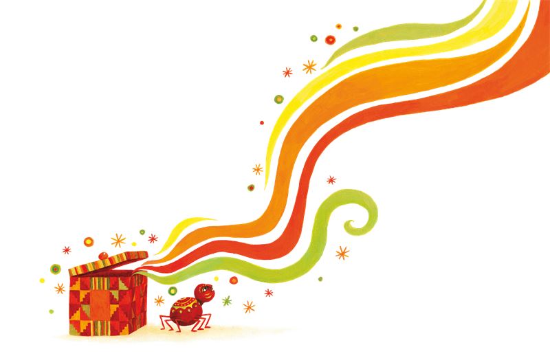 Ананси обошёл коробку, внимательно оглядел её. Коробка как коробка, она ничем не отличается от других деревянных коробок. Но что там внутри? Ананси приоткрыл крышку, и из коробки полились-потекли сказки.