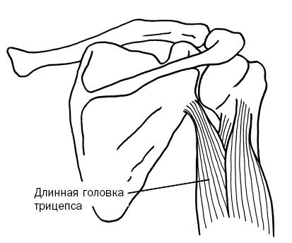 Рис. 1.14. Вид сзади на правое плечо. Сухожилие длинной головки трехглавой мышцы плеча прикрепляется к нижней стороне суставной ямки; латеральная и медиальная головки прикрепляются к задней части плечевой кости