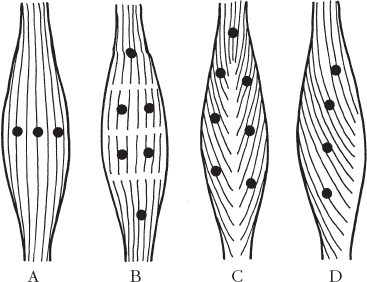 Проблема осложняется, когда волокна не тянутся с одного конца мышцы до другого. Ориентация их может быть разной в зависимости от функции мышцы (рис. 2.2). В мышце, предназначенной для быстрого движения, волокна идут параллельно (А) от одного ее конца до другого, и пусковые точки в этой мышце отыскать легко, прямо в предполагаемом месте, т. е. на полпути протяженности волокон. Но в мышцах, выполняющих силовую работу, волокна направлены диагонально, под некоторым углом к продольному направлению мышцы. Область такого расположения выглядит как перо (D), иногда разделенное пополам (C). Поскольку пусковые точки можно обнаружить в центре каждого отдельного волокна, они могут находиться в любом месте мышцы (1999, 49–53).