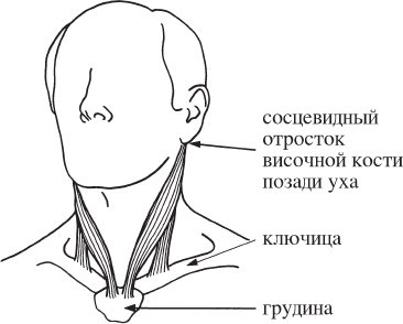 Грудино-ключично-сосцевидная мышцаНазвание грудино-ключично-сосцевидная составлено из названий костей, к которым она прикрепляется (рис. 4.1), – грудина, ключица и сосцевидный отросток височной кости позади уха. Не пугайтесь этого длинного и необычного слова. У него заразительный ритм, который вы научитесь любить: повторите его четыре раза подряд, и вы обнаружите, что танцуете. Лучше вам подружиться с вашей грудино-ключично-сосцевидной мышцей, ибо она причиняет больше бед, чем вы можете себе представить.