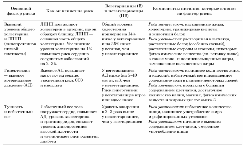 В каждой таблице (2.1, 2.2 и 2.3) в левом столбце перечислены факторы риска. Во втором столбце объясняется, как каждый фактор влияет на риски, и указана степень его воздействия, если она известна. В третьем столбце сравниваются риски для вегетарианцев и невегетарианцев. В четвёртом, последнем столбце, указаны особые продукты и составляющие рациона, которые влияют на упоминаемые риски.