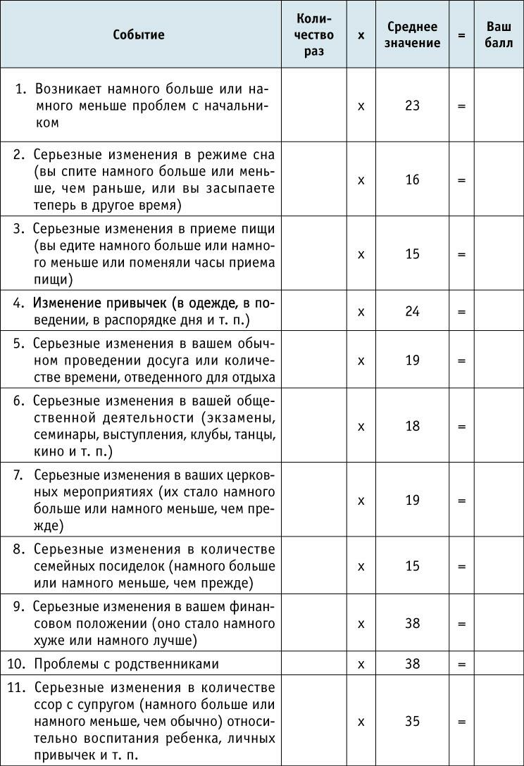 Инструкции. Поразмышляйте о каждом из жизненных событий, приведенных в таблице ниже, и вспомните, сколько раз эти события происходили в вашей жизни в прошедшем году. Запишите это число в колонке «Количество раз». (Если какое-либо событие происходило более четырех раз, ставите все же цифру 4.)