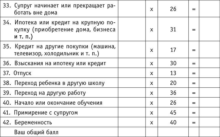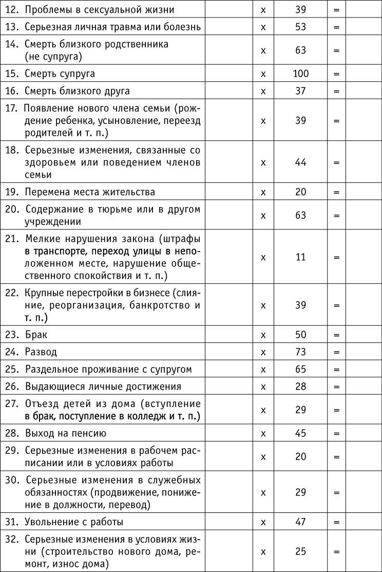 Согласно утверждениям доктора Холмса и его коллег, чем выше ваш общий балл, тем больше риск возникновения симптомов болезней, связанных со стрессом. Из тех, чей общий балл превышает 300 за последний год, почти 80 процентов рискуют заболеть в ближайшем будущем; из тех, чей общий балл составляет от 200 до 299, около 50 процентов могут заболеть в ближайшем будущем; а из тех, чей общий балл составляет от 150 до 199, только 30 процентов могут заболеть в ближайшее время. Общий балл ниже 150 показывает, что ваша вероятность заболеть очень мала. Так что чем выше ваш общий балл, тем больше придется потрудиться, чтобы остаться здоровым.