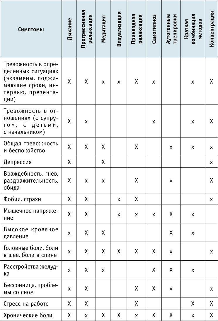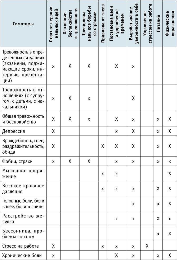 Методы снижения стресса расположены в верхней строке таблицы, а типичные симптомы, связанные со стрессом, – в столбце слева. Как вы можете заметить, для работы с большинством симптомов эффективны несколько различных методов. Наиболее эффективные методы для определенного симптома отмечены большим «Х», в то время как другие полезные методы для того же симптома отмечены маленьким «х».