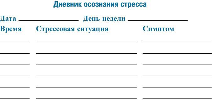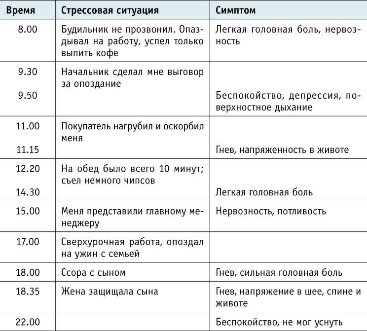 Такой дневник показывает, как отдельные стрессовые ситуации вызывают предсказуемые симптомы. Межличностная конфронтация и чашка кофе вместо полноценного завтрака вызывают напряжение в животе. Спешка может вызывать вазоконстрикцию (сужение кровеносных сосудов). А если к тому же человек практически ничего не ел в течение дня, у него с большой вероятностью понизится содержание сахара в крови, так что не удивительно, что он испытывает гнев и различные физические симптомы стресса, когда, вернувшись домой, снова оказывается в ситуации конфронтации. Вы можете использовать «Дневник осознания стресса», для того чтобы определить и систематизировать события, которые вызывают у вас стресс и характерные реакции.