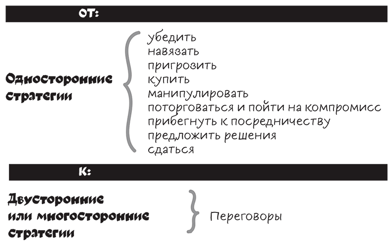 Если вам отвечают «нет», если ваша попытка договориться ни к чему не привела, тогда можете обратиться к любой из перечисленных стратегий (рис. 1.2), не забывая, что каждая из них имеет свои последствия. То, как вы рассматриваете другого человека и обращаетесь с ним, сильно влияет на то, что вы получаете в ответ[5]. В ваших же интересах видеть в нем партнера и хорошую возможность, а не проблему или досадную помеху.