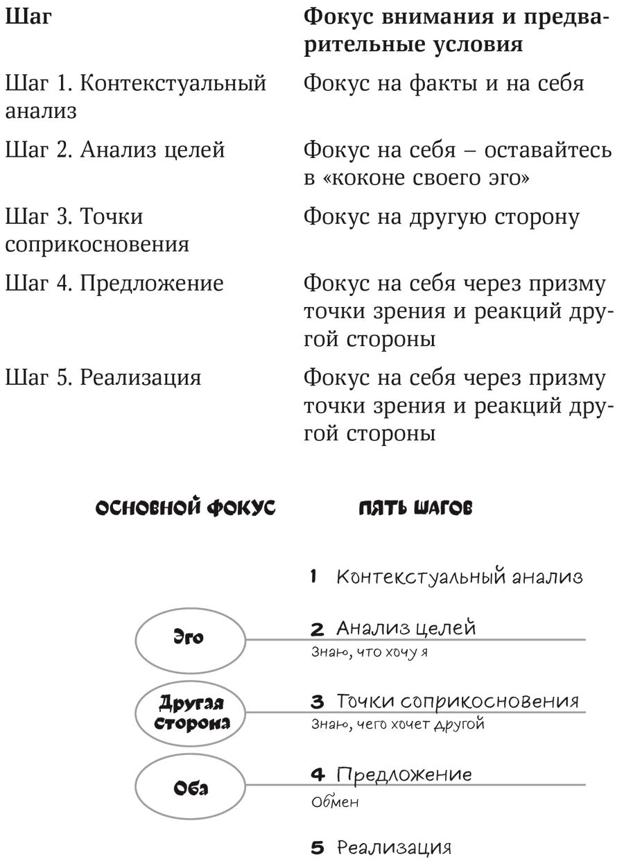 В этой главе представлены пять шагов, составляющих переговорный процесс. Если подобным образом разбить его на части и систематизировать, это поможет структурировать переговоры и снабдить переговорщика практическим руководством, как применять четкую методологию и специальный инструментарий.